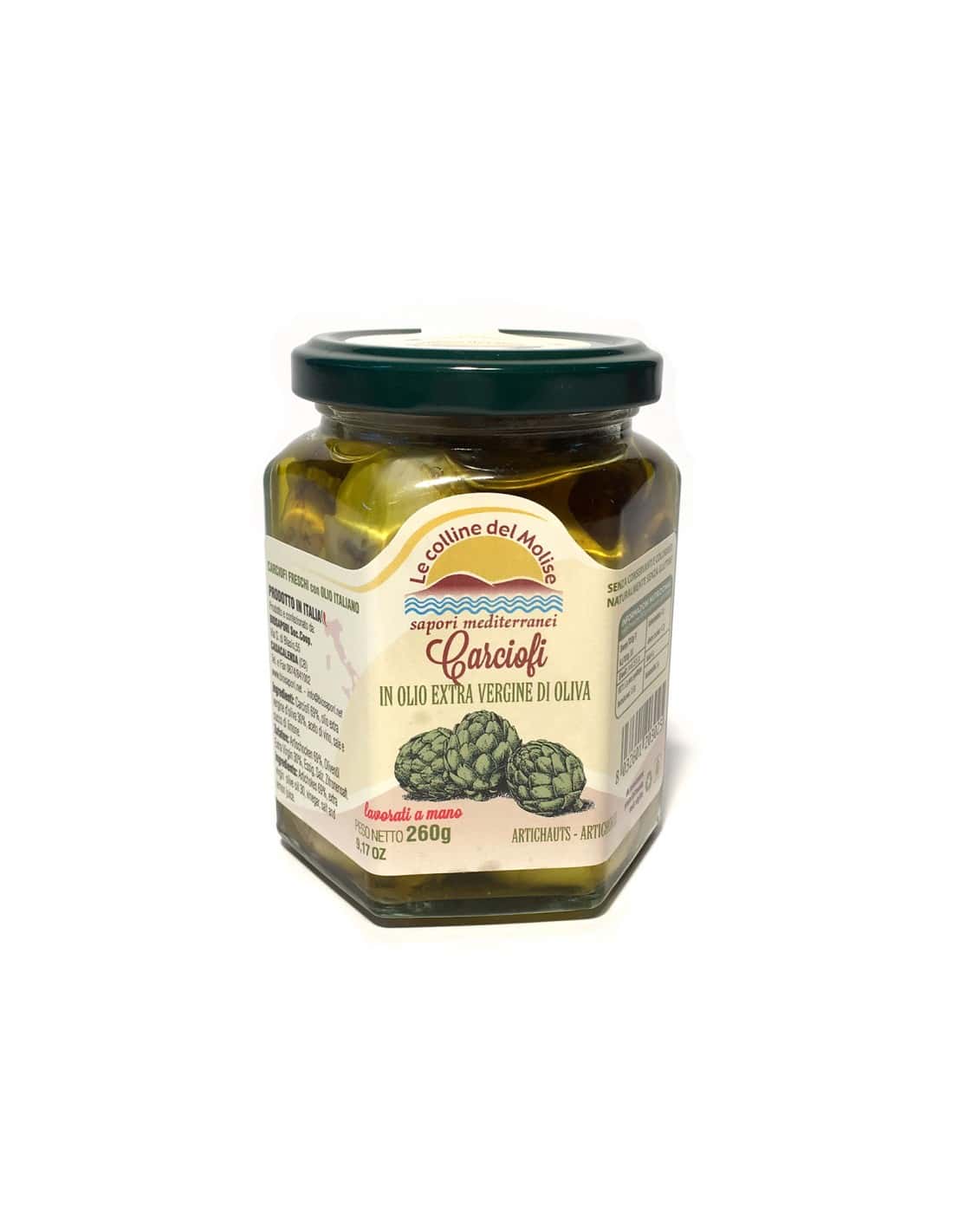 Ingrédients : artichauts, huile d’olive extra vierge, vinaigre de vin blanc, sel et arôme naturel.